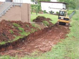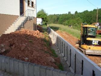 | Stützwandelemente geliefert, vorbereitende Erdarbeiten | Fertige Stützmauer |